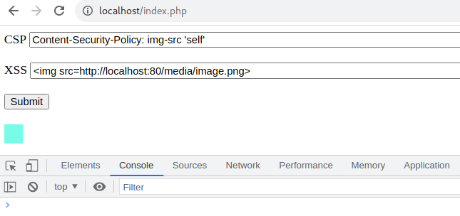 Consider the above scenario where the img-src directive in a CSP policy is set to “self”. This configuration allows images to load only from the same origin as the page—say, localhost. If an attacker attempts to inject an external image to trigger an XSS attack, the CSP policy will block the image from loading. This directive thus ensures that only trusted, internal image sources are rendered, protecting the application from potential XSS vulnerabilities.