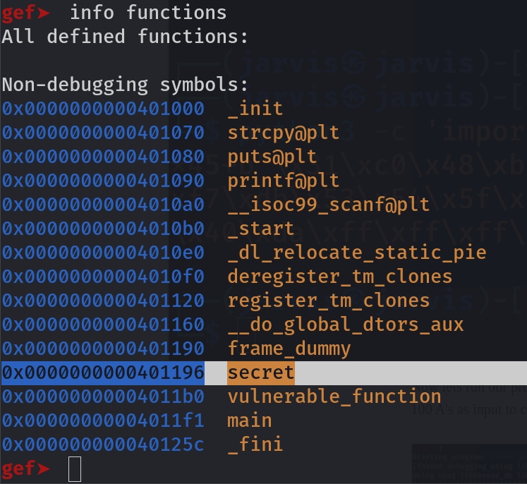 You can see all the functions used in the code are here. But we are interested in the secret function, so note its mem address i.e. 0x0000000000401196.
