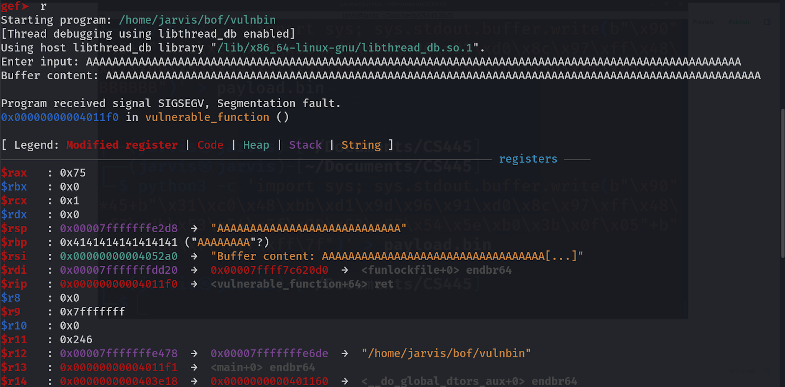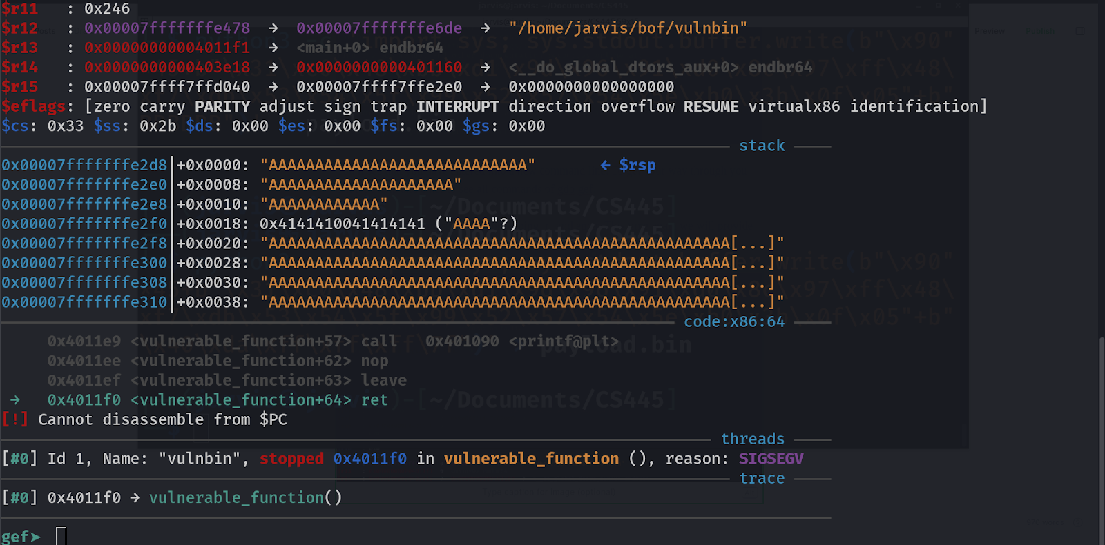 This means that the actual value of $rsp (stack pointer) was 0x00007fffffffe2d8 but because we supplied input so long that it started interfering with the stack pointer and filled it with all A’s.