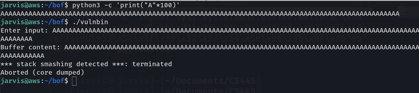 Okay, everything went smoothly, no problem. But we want to create problem, so this time try it with 100 A’s. For that you can use our good old friend python3 to print these A’s like this: