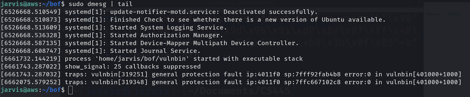 Finally this time we get different output. It says Segmentation fault. It’s clear that we managed to break the program. Let’s get into details of exactly what and where it broke. You can easily achieve this by using a tool dmesg which logs all kernel errors in it. You will need root permission for that so put sudo and pipe its output to the tail command which will only show the important last 5 lines of it.